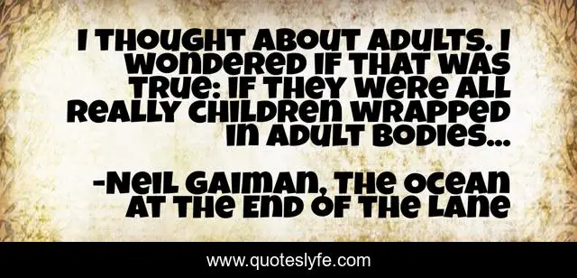 This page presents the quote "I thought about adults. I wondered if that was true: if they were all really children wrapped in adult bodies...". Author of this quote is Neil Gaiman, The Ocean at the End of the Lane. This quote is about adults, inner-child, children,.