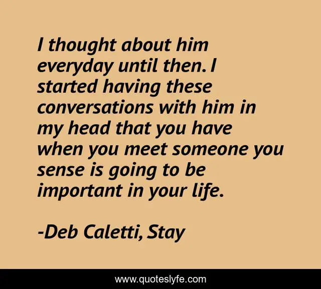 This page presents the quote "I thought about him everyday until then. I started having these conversations with him in my head that you have when you meet someone you sense is going to be important in your life.". Author of this quote is Deb Caletti, Stay. This quote is about caring, love, affection,.