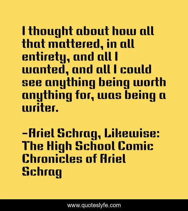 This page presents the quote "I thought about how all that mattered, in all entirety, and all I wanted, and all I could see anything being worth anything for, was being a writer.". Author of this quote is Ariel Schrag, Likewise: The High School Comic Chronicles of Ariel Schrag. This quote is about comics, writers, writing,.