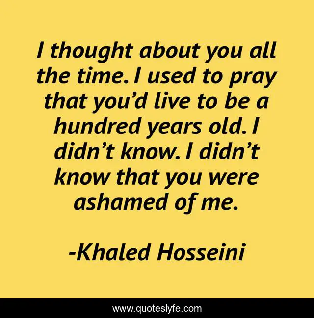 This page presents the quote "I thought about you all the time. I used to pray that you’d live to be a hundred years old. I didn’t know. I didn’t know that you were ashamed of me.". Author of this quote is Khaled Hosseini. This quote is about daughter, jalil, sorrow, men, betrayal, sad,.