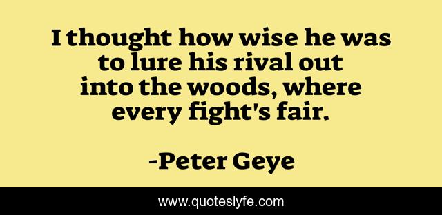 This page presents the quote "I thought how wise he was to lure his rival out into the woods, where every fight's fair.". Author of this quote is Peter Geye. This quote is about rivals, woods, fighting, wilderness,.