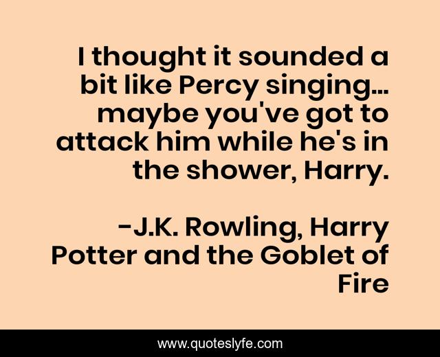 This page presents the quote "I thought it sounded a bit like Percy singing... maybe you've got to attack him while he's in the shower, Harry.". Author of this quote is J.K. Rowling, Harry Potter and the Goblet of Fire. This quote is about hp4, humor, weasley, george,.