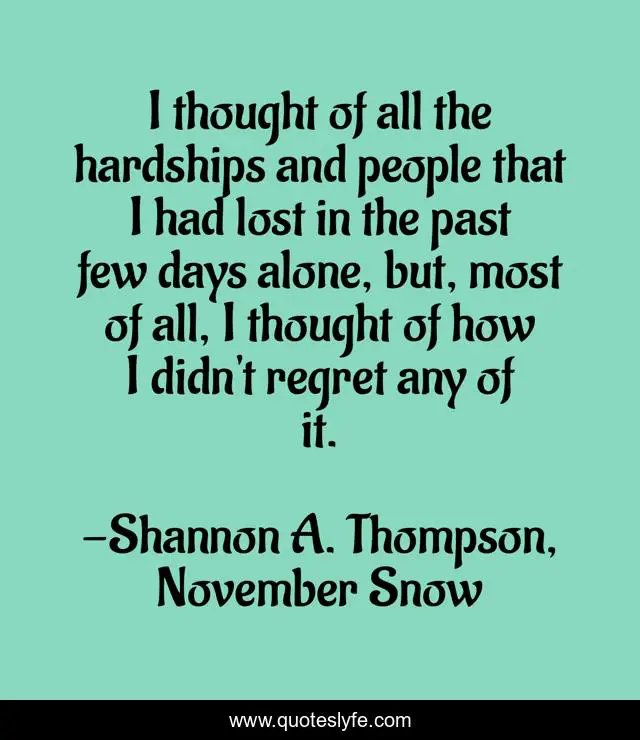 This page presents the quote "I thought of all the hardships and people that I had lost in the past few days alone, but, most of all, I thought of how I didn't regret any of it.". Author of this quote is Shannon A. Thompson, November Snow. This quote is about loss, reflection, life-lessons, pride, hardships, regret,.