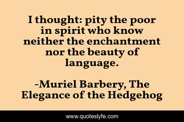 This page presents the quote "I thought: pity the poor in spirit who know neither the enchantment nor the beauty of language.". Author of this quote is Muriel Barbery, The Elegance of the Hedgehog. This quote is about language, books, literature, reading, words,.