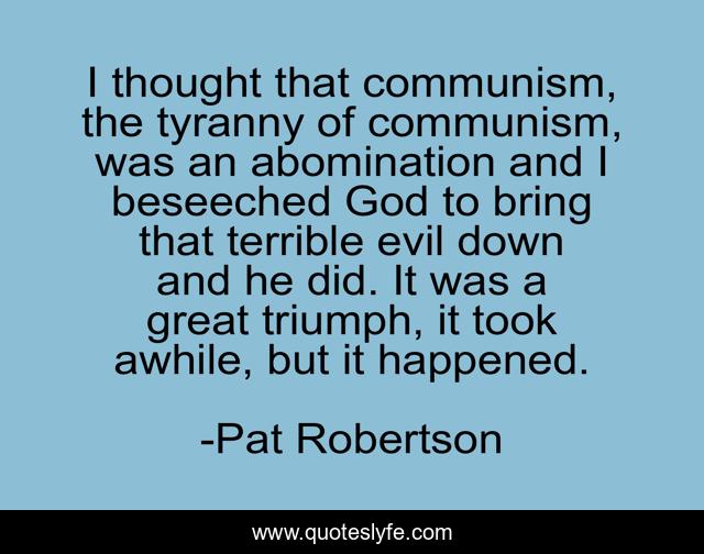 This page presents the quote "I thought that communism, the tyranny of communism, was an abomination and I beseeched God to bring that terrible evil down and he did. It was a great triumph, it took awhile, but it happened.". Author of this quote is Pat Robertson. This quote is about thought, great, evil,.