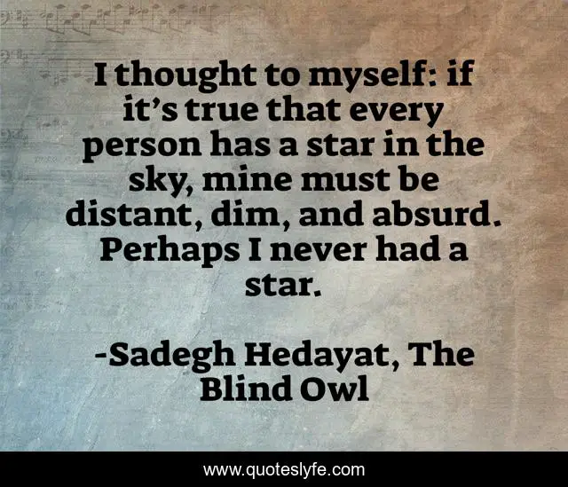 This page presents the quote "I thought to myself: if it’s true that every person has a star in the sky, mine must be distant, dim, and absurd. Perhaps I never had a star.". Author of this quote is Sadegh Hedayat, The Blind Owl. This quote is about astronomy, star, depression,.
