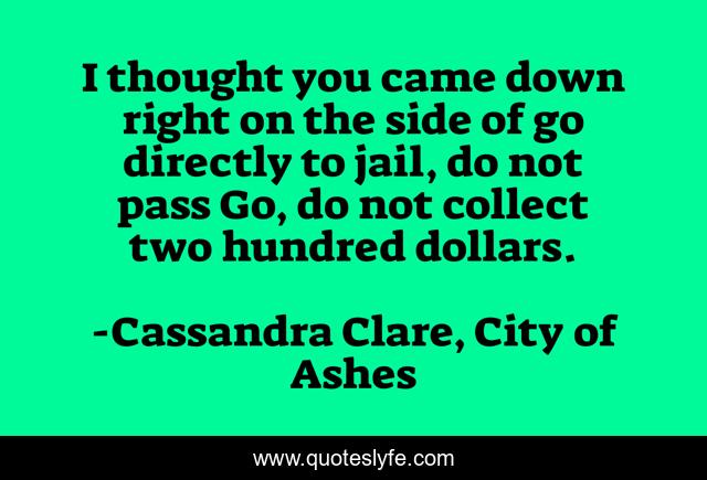 This page presents the quote "I thought you came down right on the side of go directly to jail, do not pass Go, do not collect two hundred dollars.". Author of this quote is Cassandra Clare, City of Ashes. This quote is about alec-lightwood, jace-wayland, comedy, funny,.