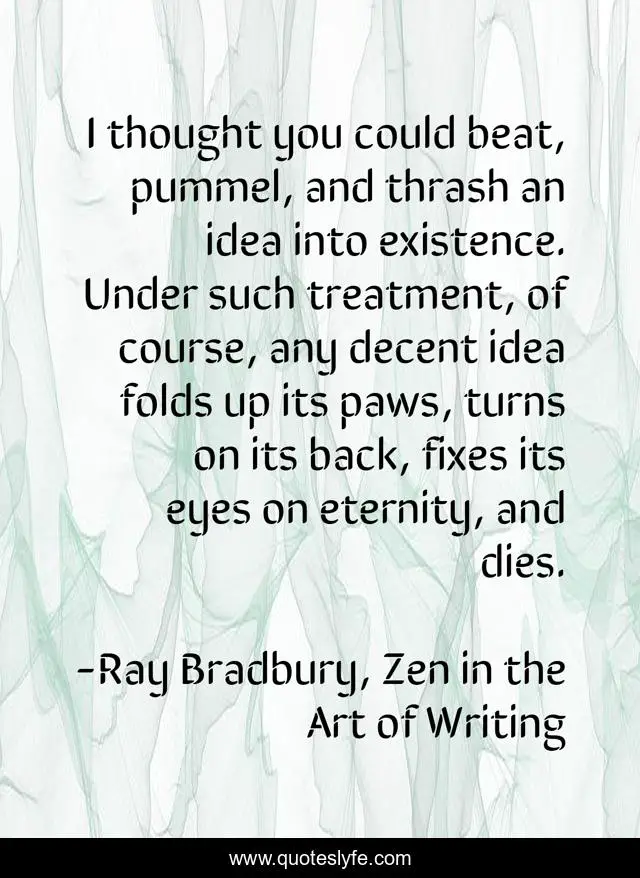 This page presents the quote "I thought you could beat, pummel, and thrash an idea into existence. Under such treatment, of course, any decent idea folds up its paws, turns on its back, fixes its eyes on eternity, and dies.". Author of this quote is Ray Bradbury, Zen in the Art of Writing. .