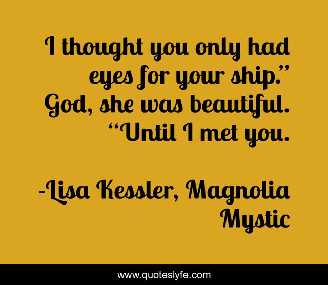 This page presents the quote "I thought you only had eyes for your ship.” God, she was beautiful. “Until I met you.". Author of this quote is Lisa Kessler, Magnolia Mystic. This quote is about holy-grail, card-readings, contemporary-romance, pirates,.