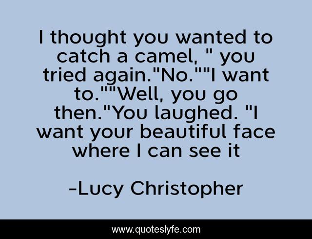 This page presents the quote "I thought you wanted to catch a camel, " you tried again."No.""I want to.""Well, you go then."You laughed. "I want your beautiful face where I can see it". Author of this quote is Lucy Christopher. This quote is about beautiful, obsession,.