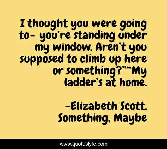 This page presents the quote "I thought you were going to— you’re standing under my window. Aren’t you supposed to climb up here or something?”“My ladder’s at home.". Author of this quote is Elizabeth Scott, Something, Maybe. This quote is about romance, young-adult, young-adult-romance, teenagers,.