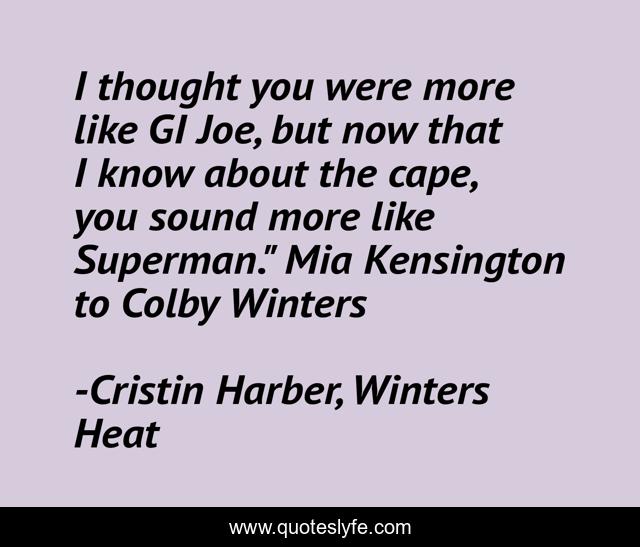 This page presents the quote "I thought you were more like GI Joe, but now that I know about the cape, you sound more like Superman." Mia Kensington to Colby Winters". Author of this quote is Cristin Harber, Winters Heat. This quote is about military-romance, romance-novel, romantic-suspense,.