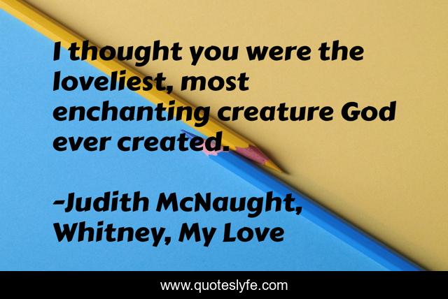 This page presents the quote "I thought you were the loveliest, most enchanting creature God ever created.". Author of this quote is Judith McNaught, Whitney, My Love. This quote is about romance, historical-romance,.