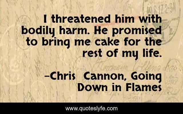 This page presents the quote "I threatened him with bodily harm. He promised to bring me cake for the rest of my life.". Author of this quote is Chris Cannon, Going Down in Flames. This quote is about ya, urban-fantasy, dragons,.