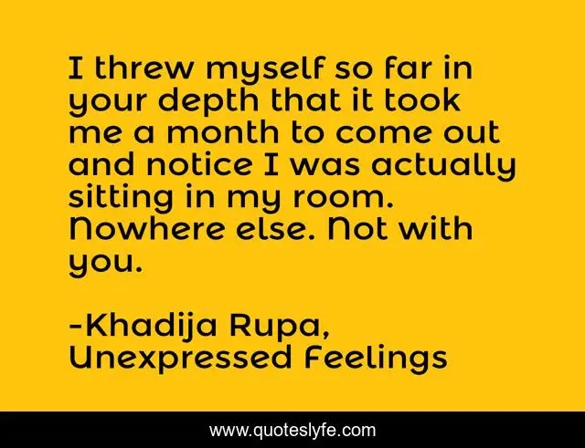 This page presents the quote "I threw myself so far in your depth that it took me a month to come out and notice I was actually sitting in my room. Nowhere else. Not with you.". Author of this quote is Khadija Rupa, Unexpressed Feelings. This quote is about khadija-rupa, love, sorrow, unexpressed-feelings, wishes, madly-in-love, affection, he,.