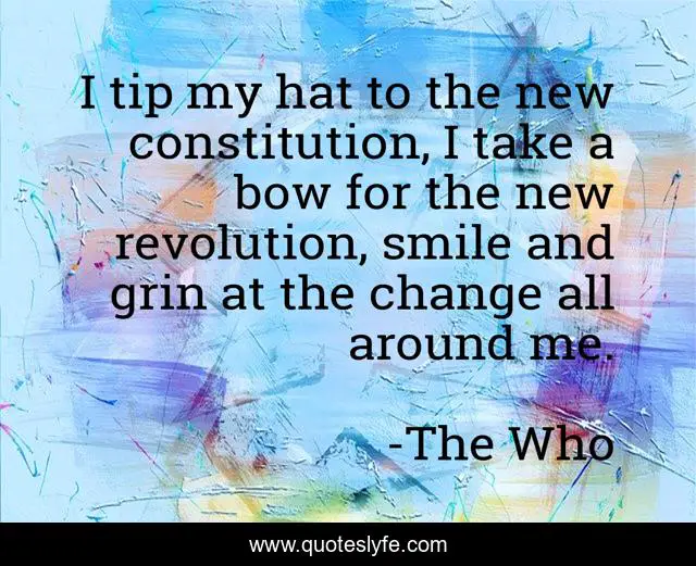 This page presents the quote "I tip my hat to the new constitution, I take a bow for the new revolution, smile and grin at the change all around me.". Author of this quote is The Who. This quote is about freedom, government,.