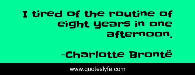 This page presents the quote "I tired of the routine of eight years in one afternoon.". Author of this quote is Charlotte Brontë. This quote is about inspirational-life, enthusiasm, jane-eyre, inspirational, personal-growth,.