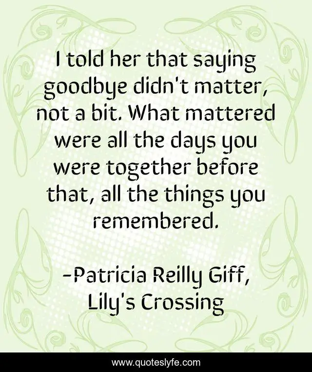 This page presents the quote "I told her that saying goodbye didn't matter, not a bit. What mattered were all the days you were together before that, all the things you remembered.". Author of this quote is Patricia Reilly Giff, Lily's Crossing. This quote is about memories, friendship, patricia-geilly-giff, goodbye, war,.