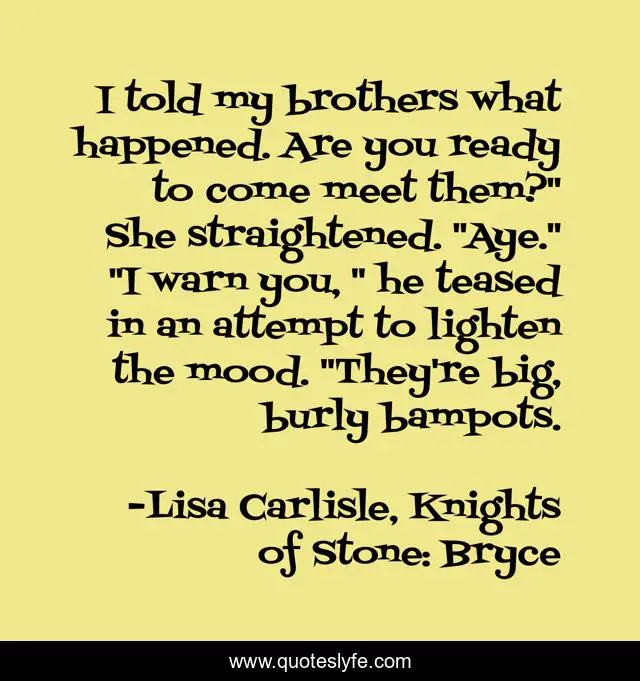 This page presents the quote "I told my brothers what happened. Are you ready to come meet them?" She straightened. "Aye." "I warn you, " he teased in an attempt to lighten the mood. "They're big, burly bampots.". Author of this quote is Lisa Carlisle, Knights of Stone: Bryce. This quote is about gargoyle-romance, paranormal-romance,.