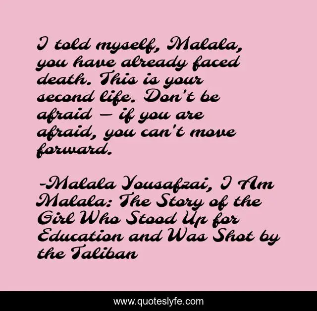 This page presents the quote "I told myself, Malala, you have already faced death. This is your second life. Don't be afraid — if you are afraid, you can't move forward.". Author of this quote is Malala Yousafzai, I Am Malala: The Story of the Girl Who Stood Up for Education and Was Shot by the Taliban. .