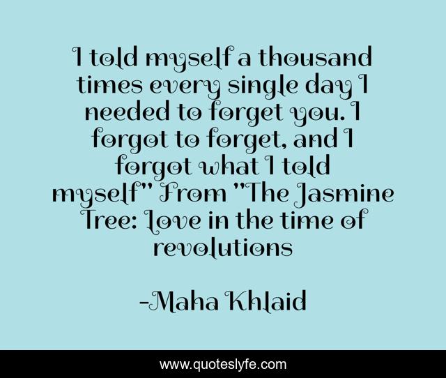 This page presents the quote "I told myself a thousand times every single day I needed to forget you. I forgot to forget, and I forgot what I told myself" From "The Jasmine Tree: Love in the time of revolutions". Author of this quote is Maha Khlaid. This quote is about romance, forget, love-story,.