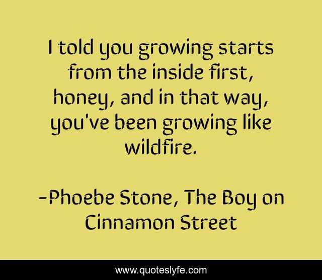 This page presents the quote "I told you growing starts from the inside first, honey, and in that way, you've been growing like wildfire.". Author of this quote is Phoebe Stone, The Boy on Cinnamon Street. This quote is about enthusiasm, humor, encouragement, inspirational,.