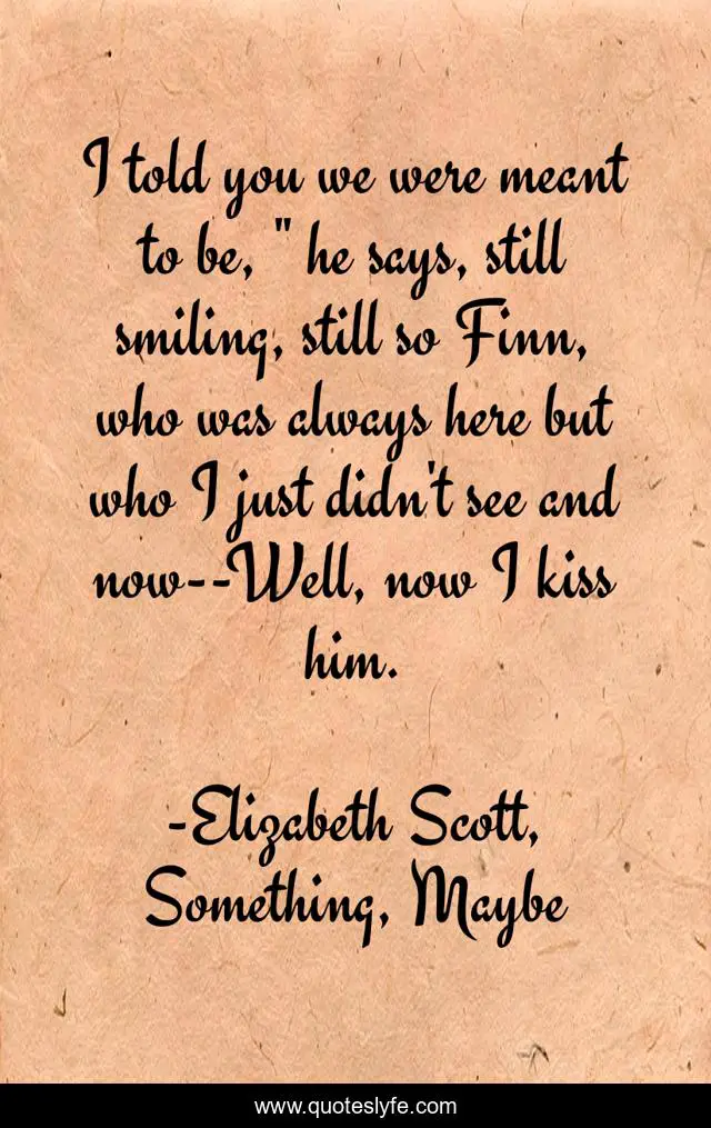 This page presents the quote "I told you we were meant to be, " he says, still smiling, still so Finn, who was always here but who I just didn't see and now--Well, now I kiss him.". Author of this quote is Elizabeth Scott, Something, Maybe. This quote is about romance, fate, kiss,.