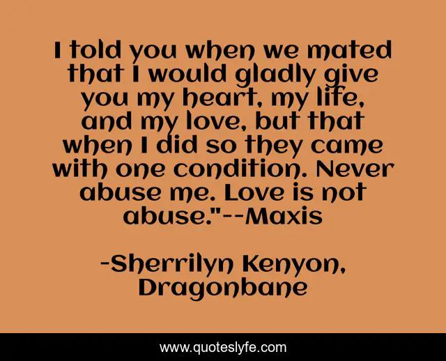 This page presents the quote "I told you when we mated that I would gladly give you my heart, my life, and my love, but that when I did so they came with one condition. Never abuse me. Love is not abuse."--Maxis". Author of this quote is Sherrilyn Kenyon, Dragonbane. This quote is about love, abuse, mated, affection,.