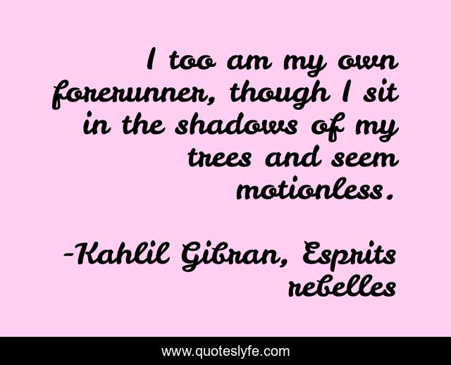 This page presents the quote "I too am my own forerunner, though I sit in the shadows of my trees and seem motionless.". Author of this quote is Kahlil Gibran, Esprits rebelles. This quote is about existentialism, philosophy-of-life,.
