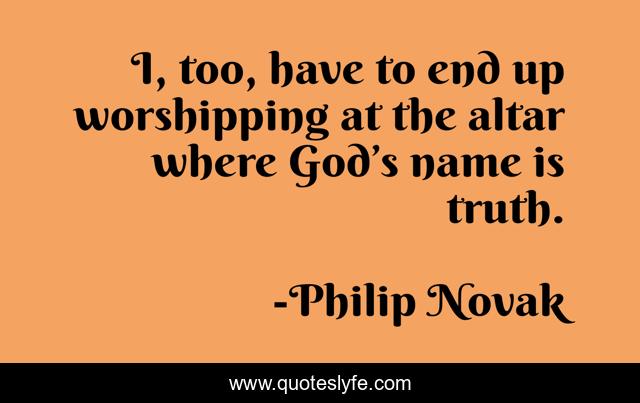 This page presents the quote "I, too, have to end up worshipping at the altar where God’s name is truth.". Author of this quote is Philip Novak. This quote is about friederich-nietzsche, god-is-not-dead, a-w-tozer, truth-is-an-attribute-of-god, god-is-truth, the-way-the-truth-the-life, god-is-dead, jesus, atheism,.