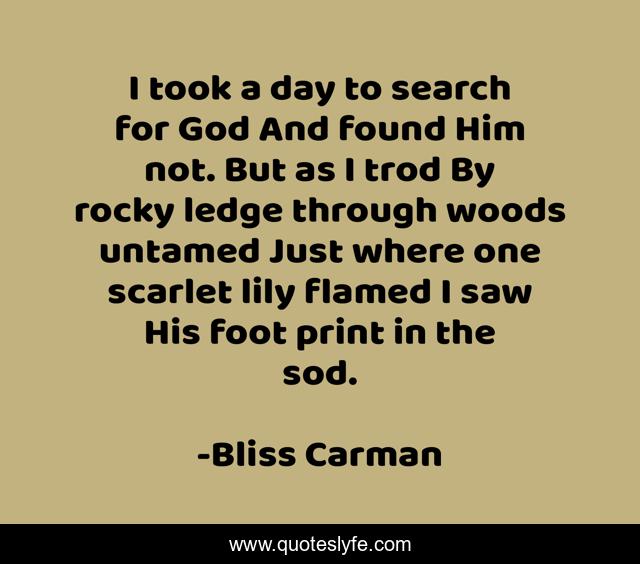 This page presents the quote "I took a day to search for God And found Him not. But as I trod By rocky ledge through woods untamed Just where one scarlet lily flamed I saw His foot print in the sod.". Author of this quote is Bliss Carman. .