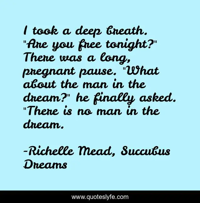 This page presents the quote "I took a deep breath. "Are you free tonight?" There was a long, pregnant pause. "What about the man in the dream?" he finally asked. "There is no man in the dream.". Author of this quote is Richelle Mead, Succubus Dreams. This quote is about giving-up, dreams,.