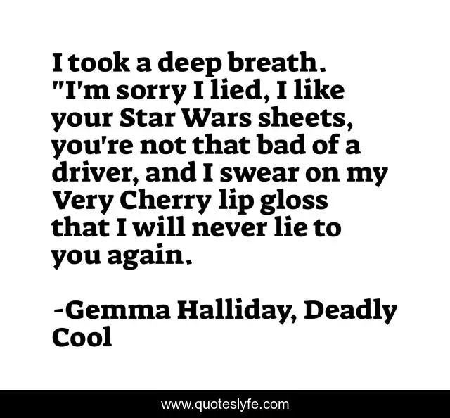 This page presents the quote "I took a deep breath. "I'm sorry I lied, I like your Star Wars sheets, you're not that bad of a driver, and I swear on my Very Cherry lip gloss that I will never lie to you again.". Author of this quote is Gemma Halliday, Deadly Cool. This quote is about humor, humour,.