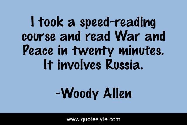 This page presents the quote "I took a speed-reading course and read War and Peace in twenty minutes. It involves Russia.". Author of this quote is Woody Allen. This quote is about course, peace, russia,.