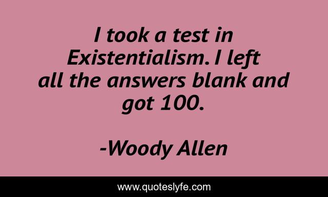 This page presents the quote "I took a test in Existentialism. I left all the answers blank and got 100.". Author of this quote is Woody Allen. This quote is about existentialism, uncertainty, humor,.