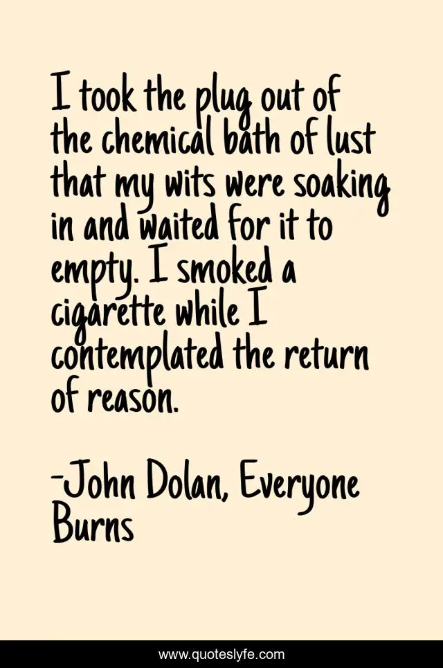 This page presents the quote "I took the plug out of the chemical bath of lust that my wits were soaking in and waited for it to empty. I smoked a cigarette while I contemplated the return of reason.". Author of this quote is John Dolan, Everyone Burns. This quote is about lust, reason,.