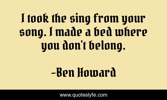 This page presents the quote "I took the sing from your song. I made a bed where you don't belong.". Author of this quote is Ben Howard. This quote is about anger, emotional, music-lyrics,.