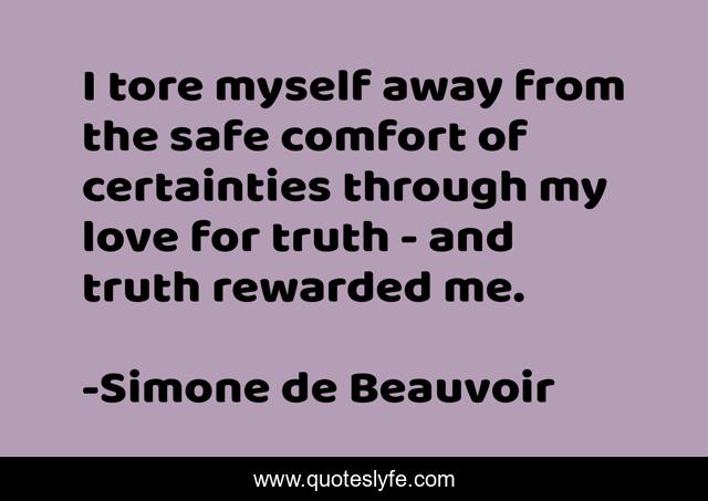 This page presents the quote "I tore myself away from the safe comfort of certainties through my love for truth - and truth rewarded me.". Author of this quote is Simone de Beauvoir. This quote is about me, myself, love, affection,.