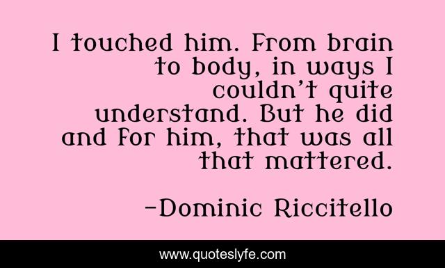 This page presents the quote "I touched him. From brain to body, in ways I couldn’t quite understand. But he did and for him, that was all that mattered.". Author of this quote is Dominic Riccitello. This quote is about body, life, love, relationship, feelings, past, brain, unconditional, truth,.