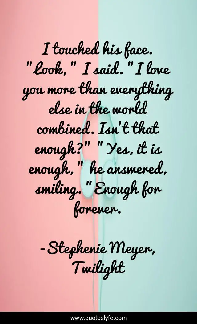 This page presents the quote "I touched his face. "Look, " I said. "I love you more than everything else in the world combined. Isn't that enough?" "Yes, it is enough, " he answered, smiling. "Enough for forever.". Author of this quote is Stephenie Meyer, Twilight. .