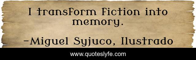 This page presents the quote "I transform fiction into memory.". Author of this quote is Miguel Syjuco, Ilustrado. This quote is about fiction, memory,.