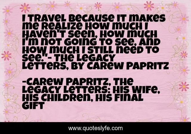 This page presents the quote "I travel because it makes me realize how much I haven't seen, how much I'm not going to see, and how much I still need to see."- The Legacy Letters, by Carew Papritz". Author of this quote is Carew Papritz, The Legacy Letters: his Wife, his Children, his Final Gift. This quote is about quote, travel, the-legacy-letters, carew-papritz, quotes,.