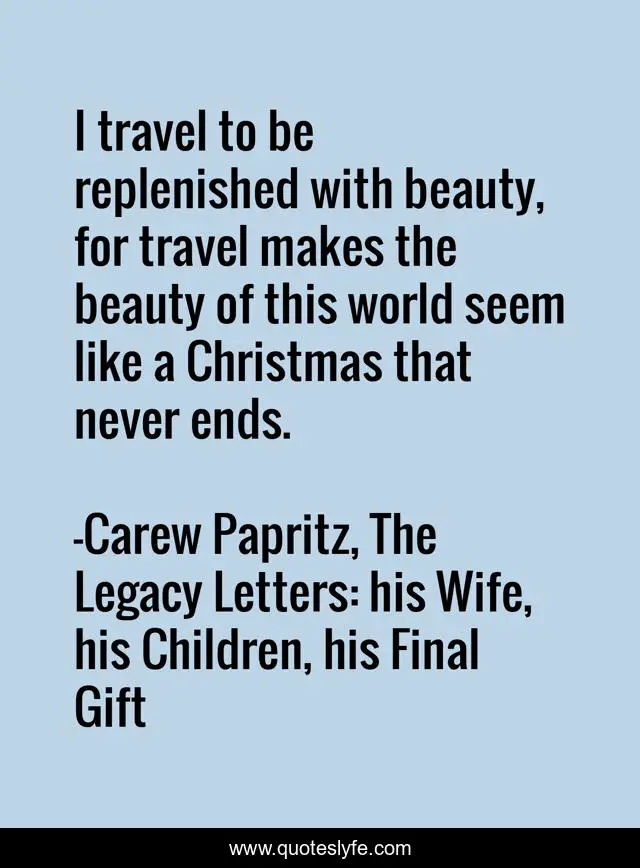 This page presents the quote "I travel to be replenished with beauty, for travel makes the beauty of this world seem like a Christmas that never ends.". Author of this quote is Carew Papritz, The Legacy Letters: his Wife, his Children, his Final Gift. This quote is about quote, travel, quotes, book, the-legacy-letters, carew-papritz, christmas,.