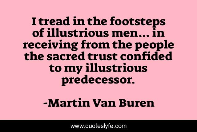 This page presents the quote "I tread in the footsteps of illustrious men... in receiving from the people the sacred trust confided to my illustrious predecessor.". Author of this quote is Martin Van Buren. This quote is about men, sacred, people,.