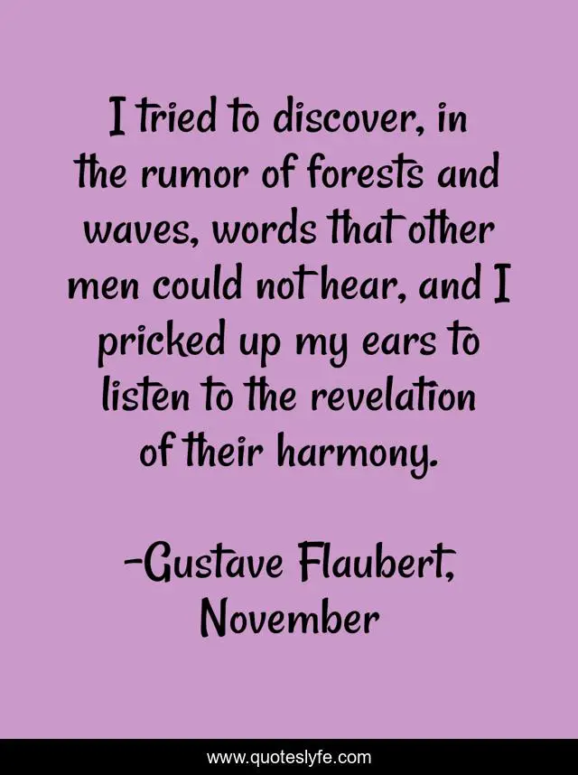 This page presents the quote "I tried to discover, in the rumor of forests and waves, words that other men could not hear, and I pricked up my ears to listen to the revelation of their harmony.". Author of this quote is Gustave Flaubert, November. This quote is about words, language, nature, forests, harmony, listening, waves,.