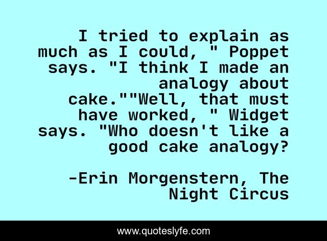 This page presents the quote "I tried to explain as much as I could, " Poppet says. "I think I made an analogy about cake.""Well, that must have worked, " Widget says. "Who doesn't like a good cake analogy?". Author of this quote is Erin Morgenstern, The Night Circus. This quote is about cake, humorous, widget,.