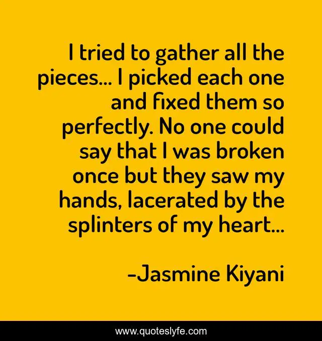This page presents the quote "I tried to gather all the pieces… I picked each one and fixed them so perfectly. No one could say that I was broken once but they saw my hands, lacerated by the splinters of my heart…". Author of this quote is Jasmine Kiyani. This quote is about perfect, heart, broken, splinters, fixed, pieces-of-perfection-hands,.