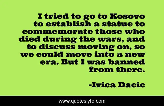 This page presents the quote "I tried to go to Kosovo to establish a statue to commemorate those who died during the wars, and to discuss moving on, so we could move into a new era. But I was banned from there.". Author of this quote is Ivica Dacic. This quote is about new, new era, moving,.