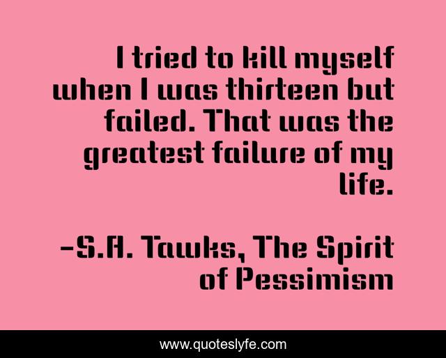 This page presents the quote "I tried to kill myself when I was thirteen but failed. That was the greatest failure of my life.". Author of this quote is S.A. Tawks, The Spirit of Pessimism. This quote is about spirituality, author, writing, imagination, reader, reading,.