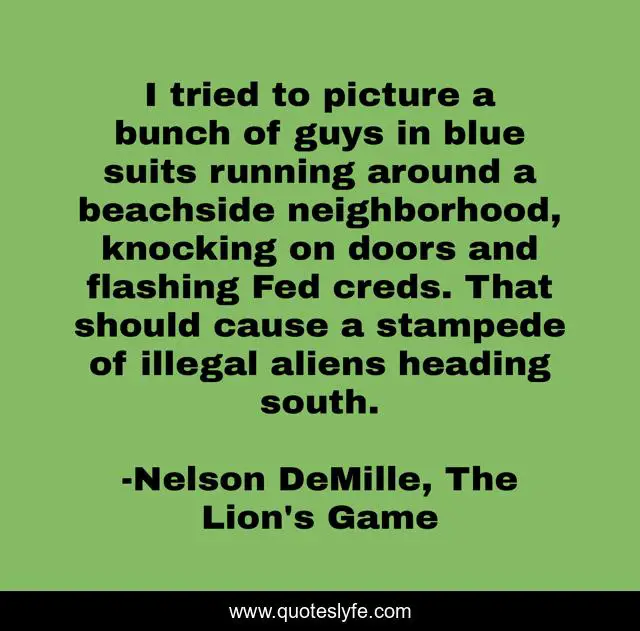 This page presents the quote "I tried to picture a bunch of guys in blue suits running around a beachside neighborhood, knocking on doors and flashing Fed creds. That should cause a stampede of illegal aliens heading south.". Author of this quote is Nelson DeMille, The Lion's Game. This quote is about witty, funny, comedy,.